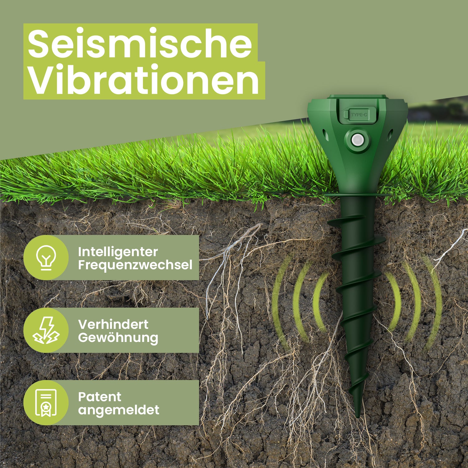Unser Maulwurfvertreiber nutzt zufällige Vibrationen, um Maulwürfe und Wühlmäuse effektiv fernzuhalten. Im Gegensatz zu herkömmlichen Geräten, die in festen Intervallen arbeiten, verhindert die unvorhersehbare Frequenz eine Gewöhnung der Tiere – so bleibt Ihr Garten dauerhaft geschützt!